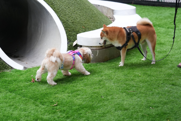 外の音、匂い、人や犬との距離感など犬社会を学べる時間でもあります。
